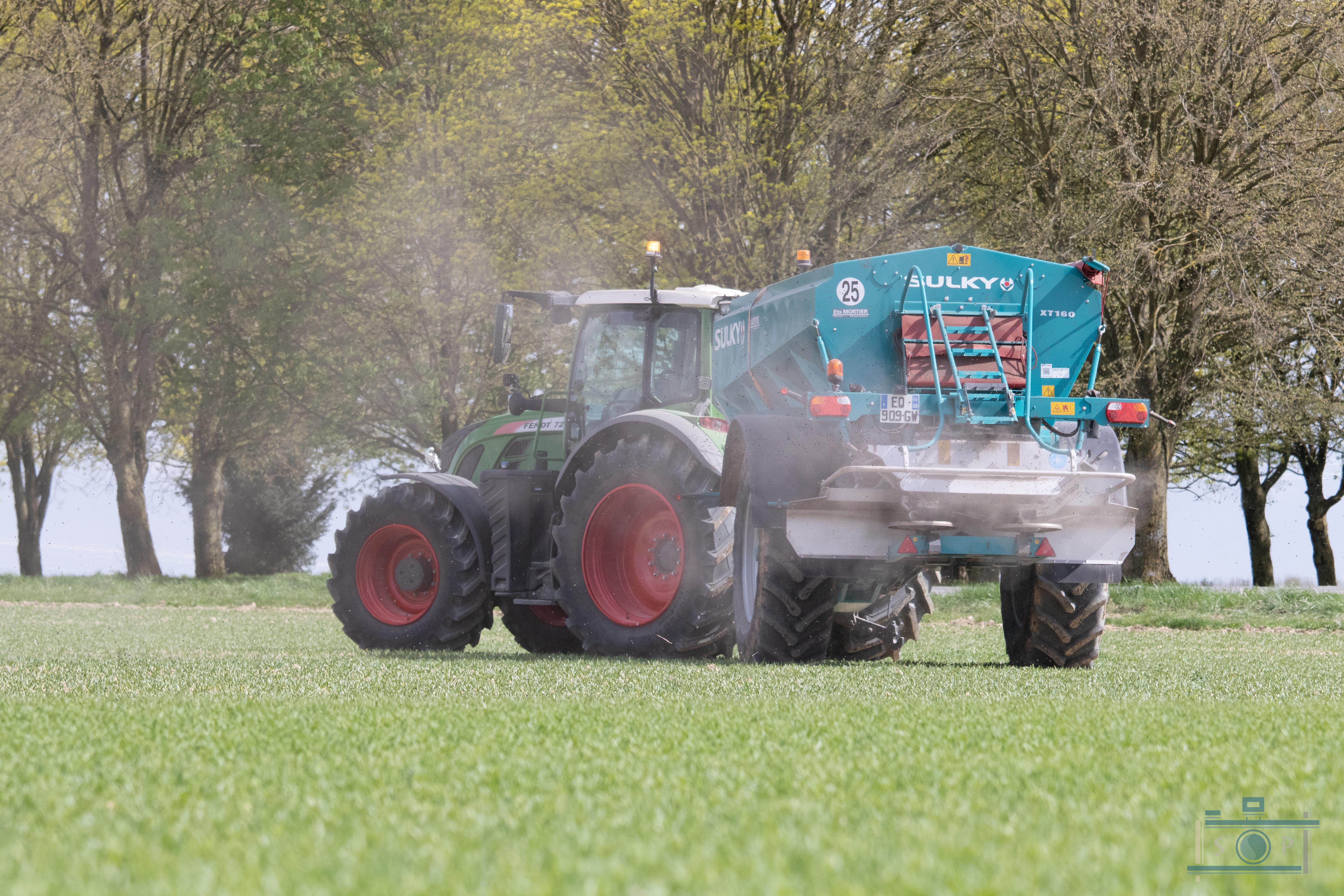 Chantier d’épandage de pellets organiques – Sulky XT160 – Fendt 720