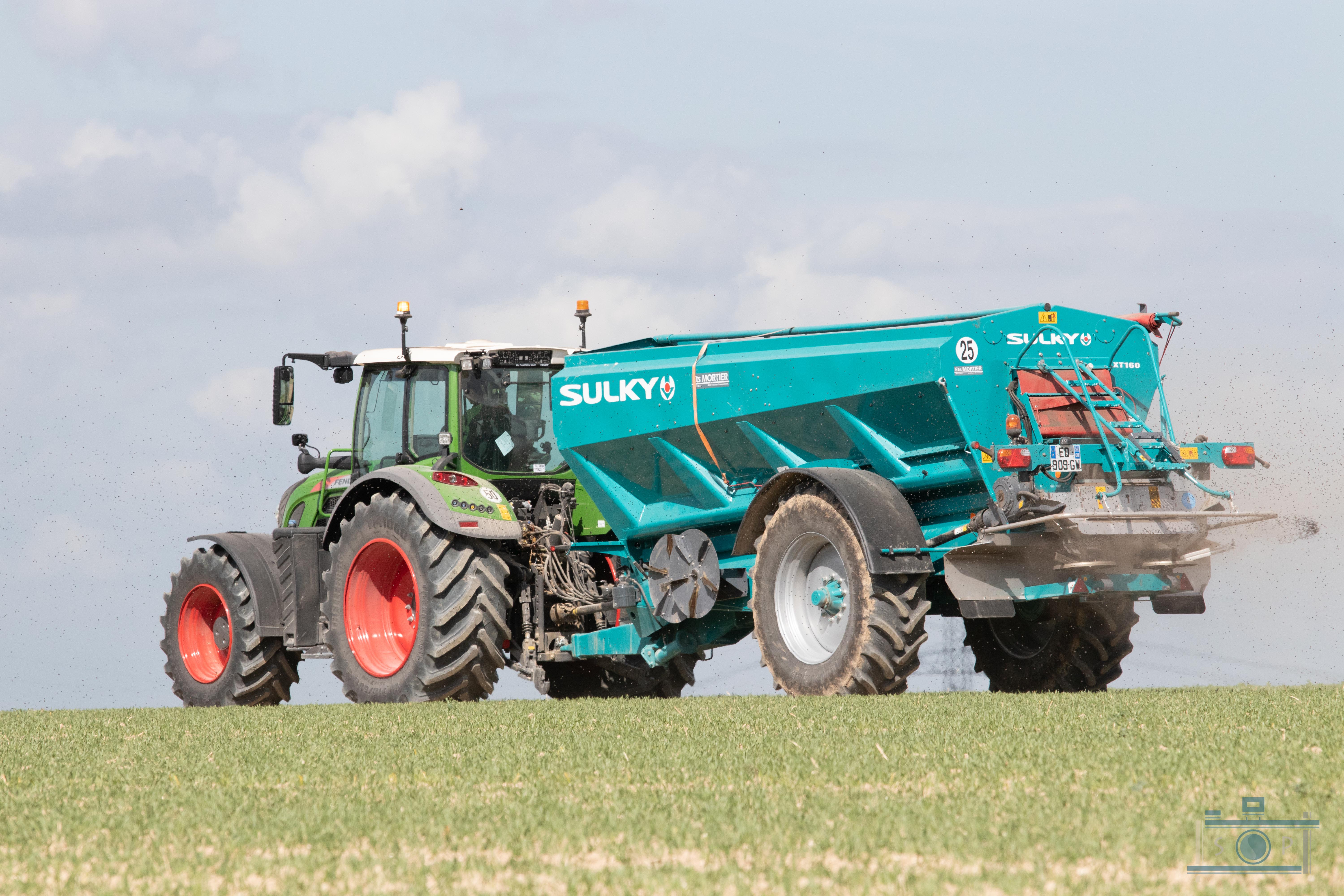Chantier d’épandage de pellets organiques – Sulky XT160 – Fendt 720