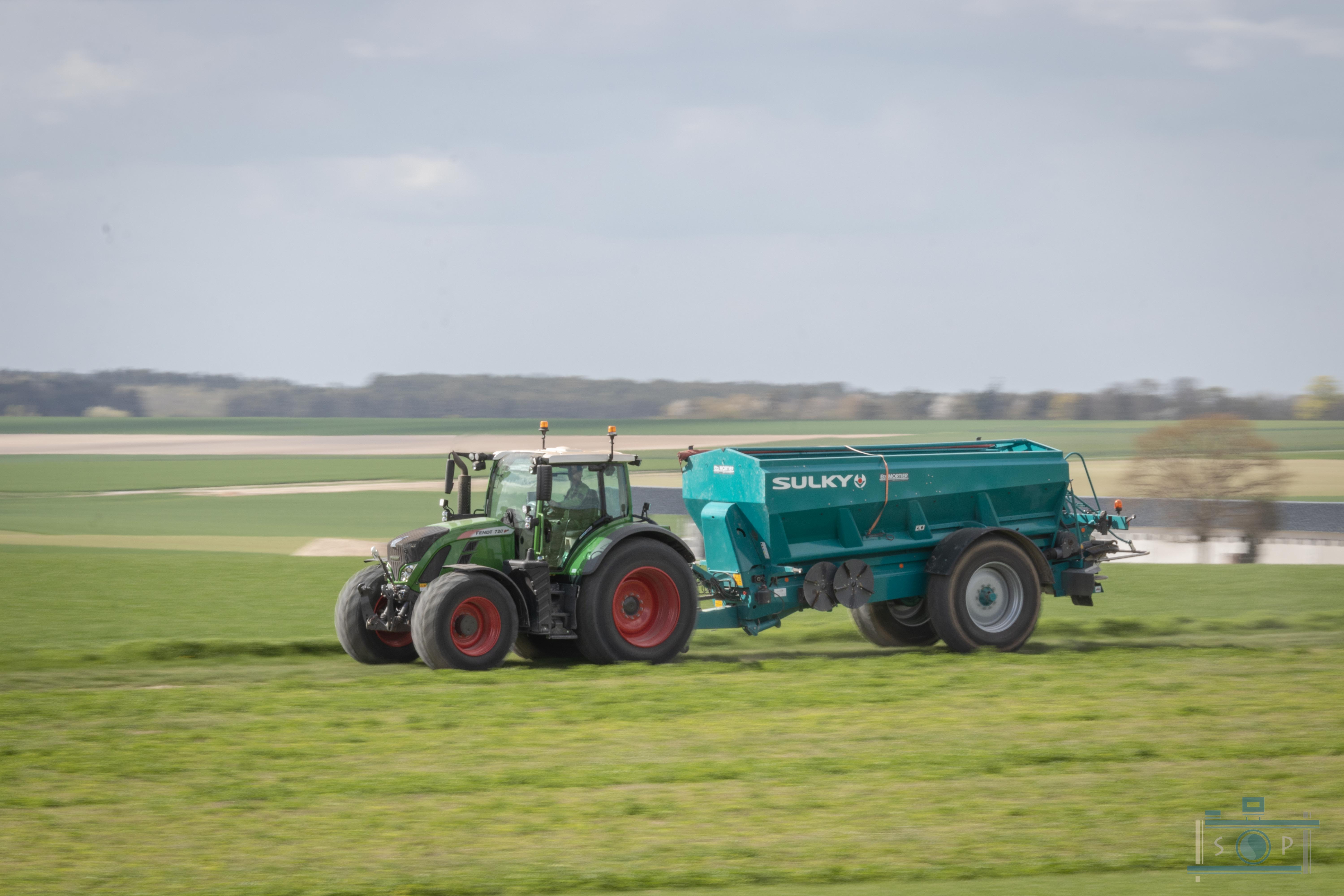 Chantier d’épandage de pellets organiques – Sulky XT160 – Fendt 720