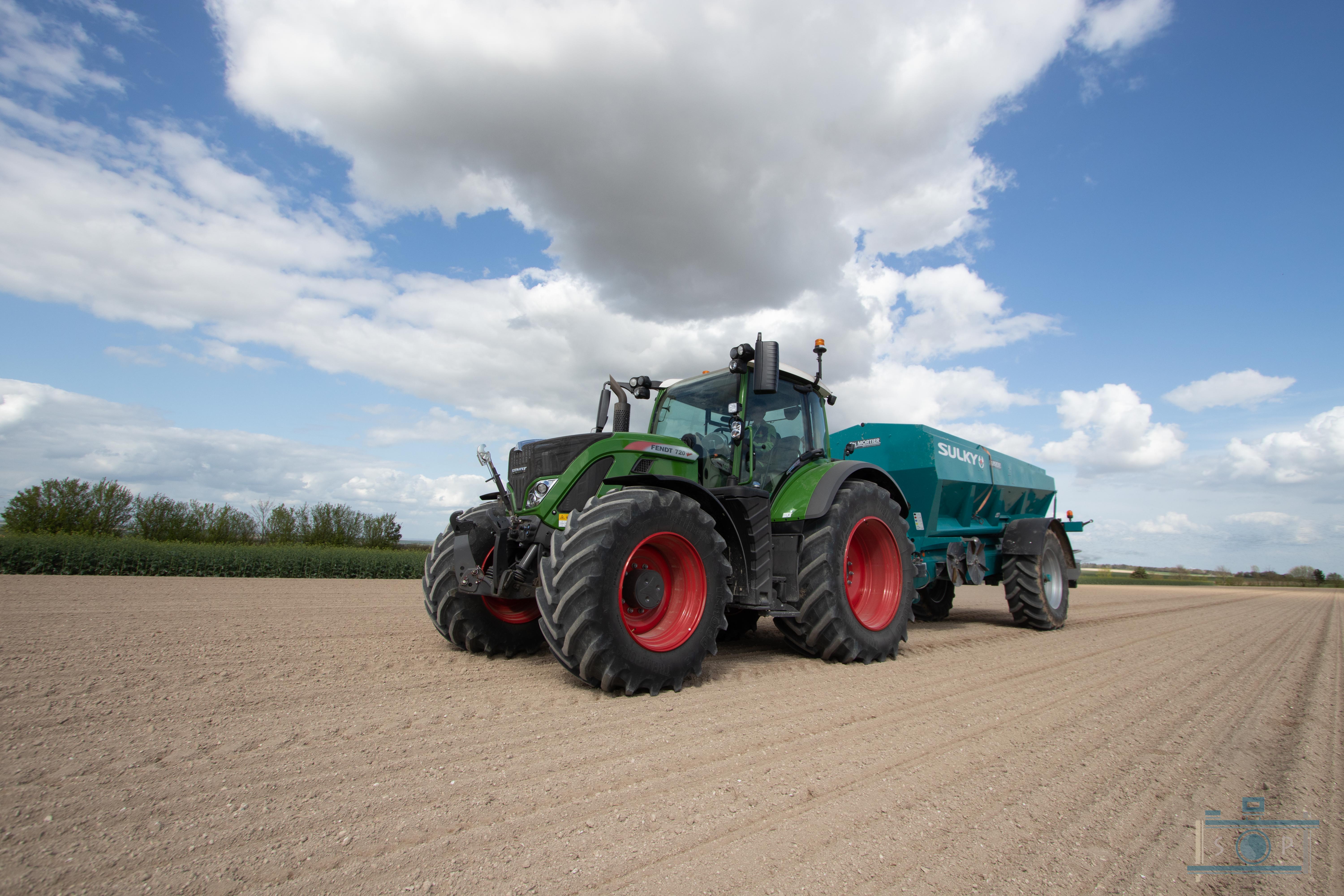 Chantier d’épandage de pellets organiques – Sulky XT160 – Fendt 720