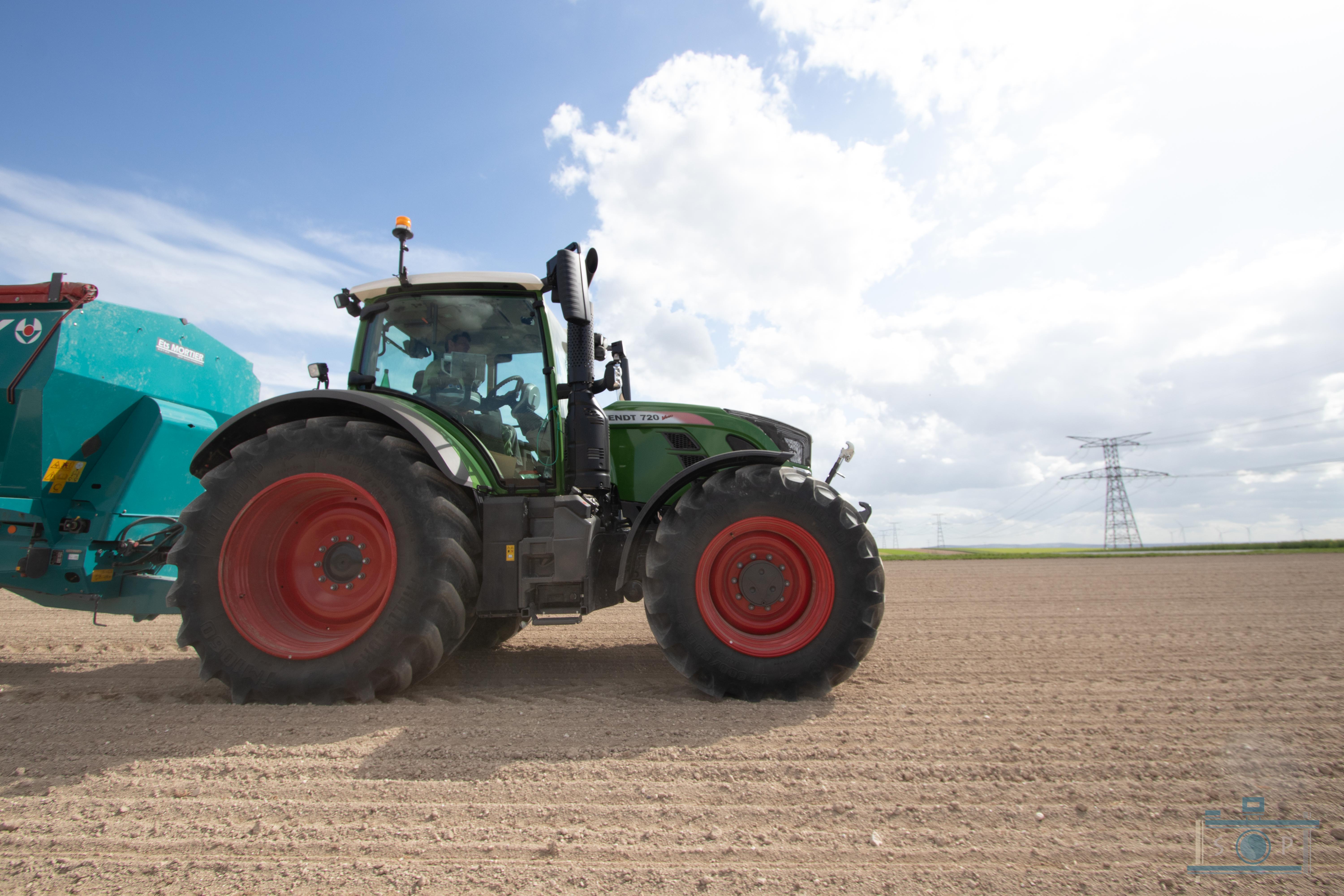 Chantier d’épandage de pellets organiques – Sulky XT160 – Fendt 720