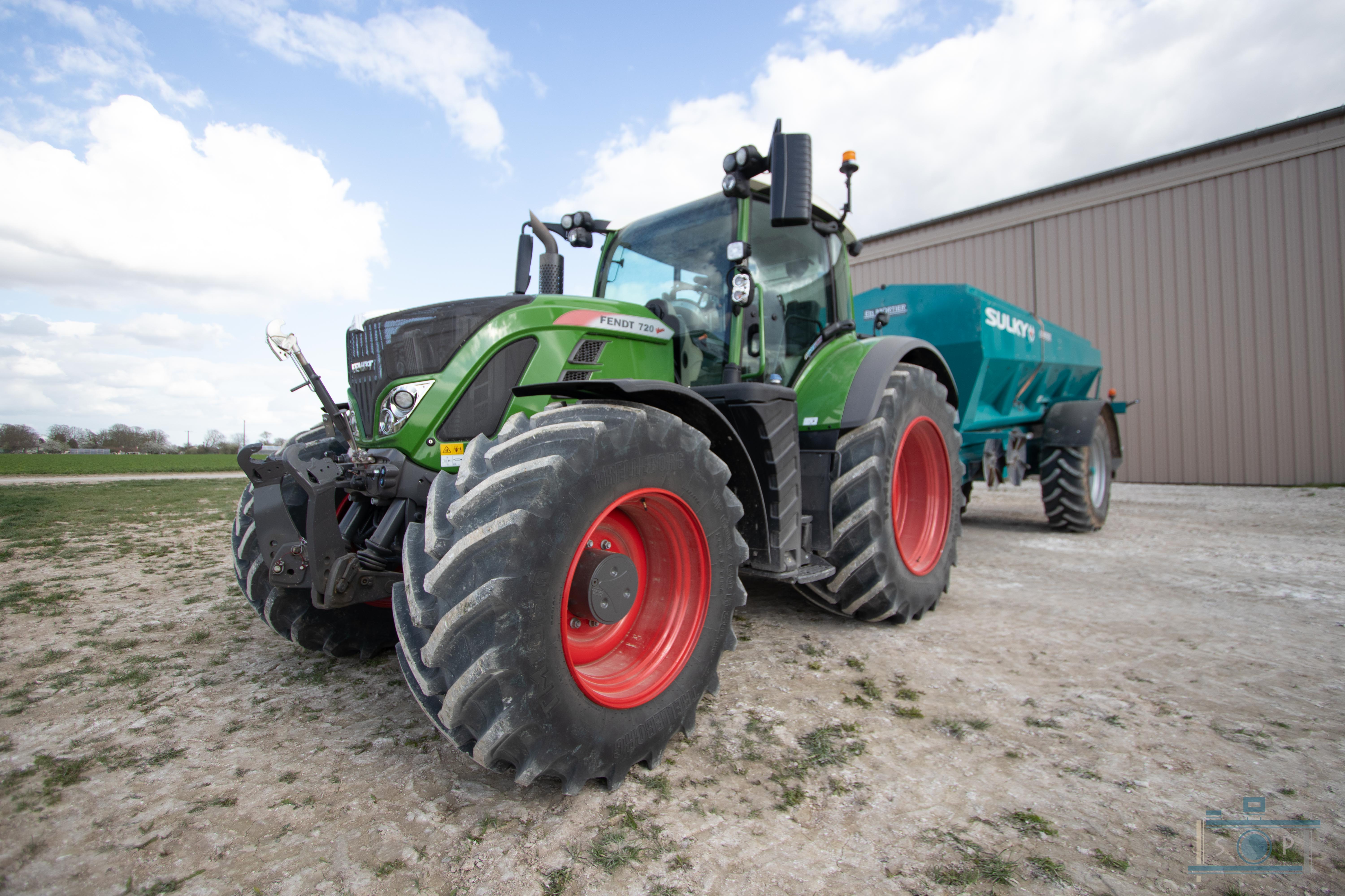 Chantier d’épandage de pellets organiques – Sulky XT160 – Fendt 720