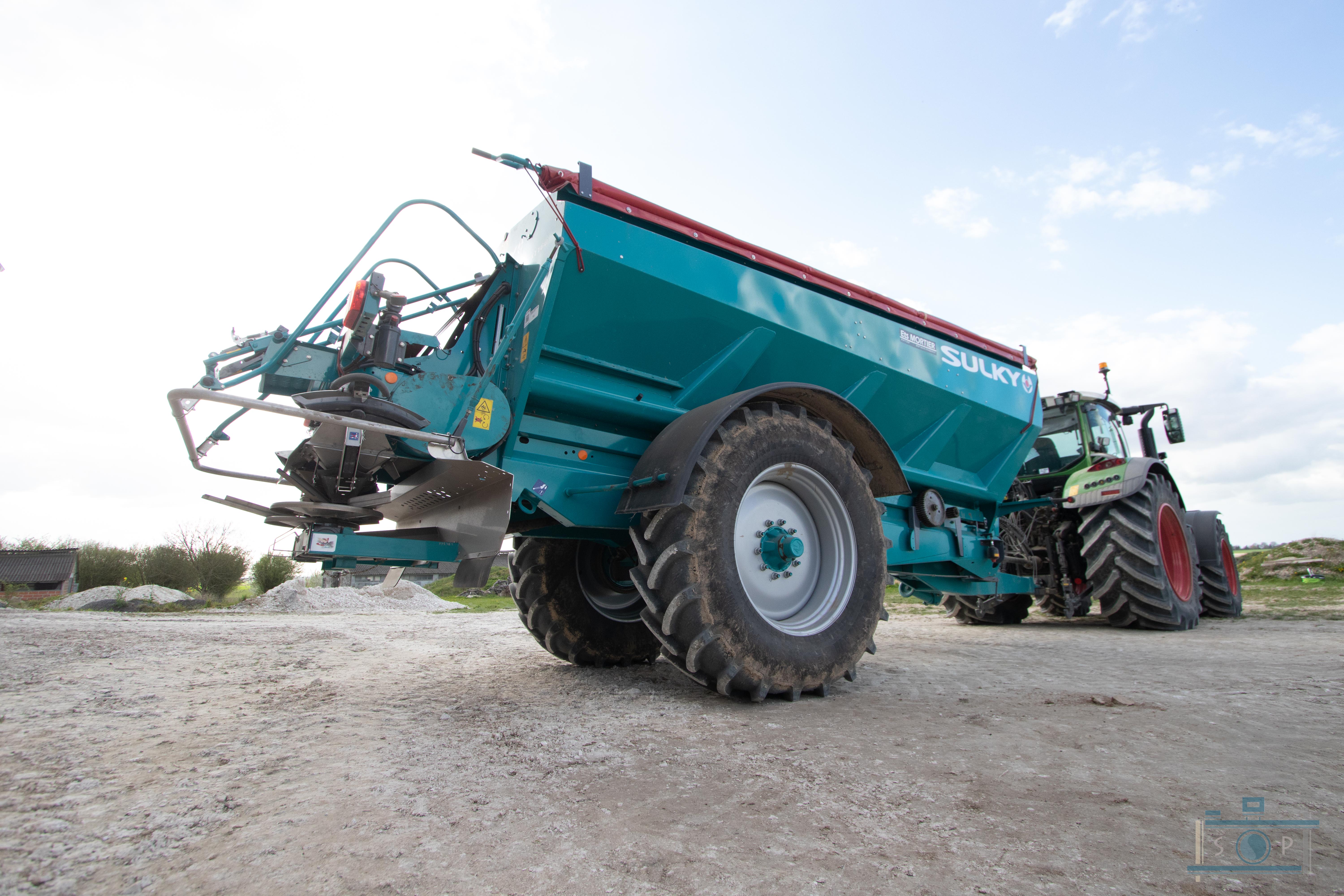 Chantier d’épandage de pellets organiques – Sulky XT160 – Fendt 720
