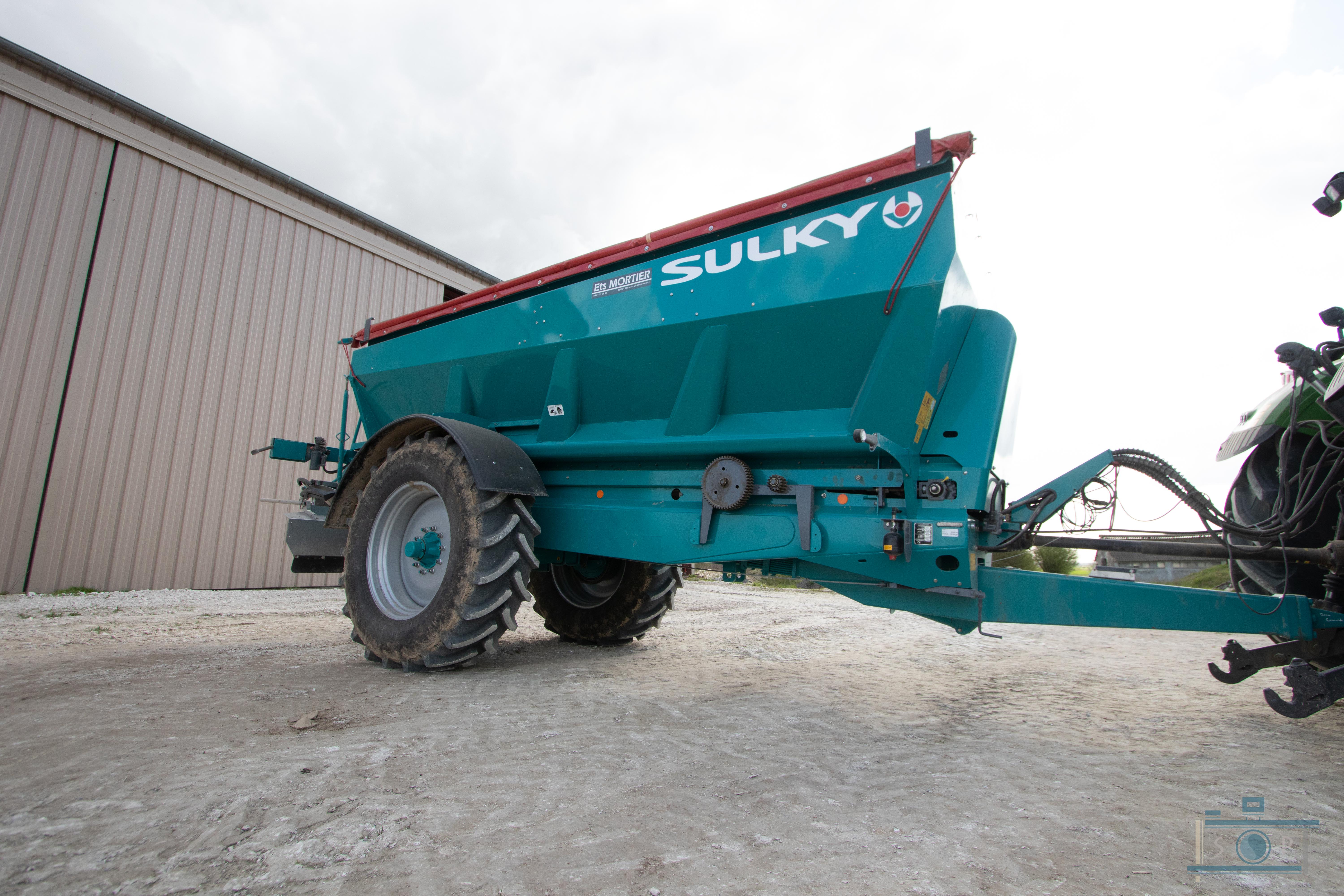Chantier d’épandage de pellets organiques – Sulky XT160 – Fendt 720