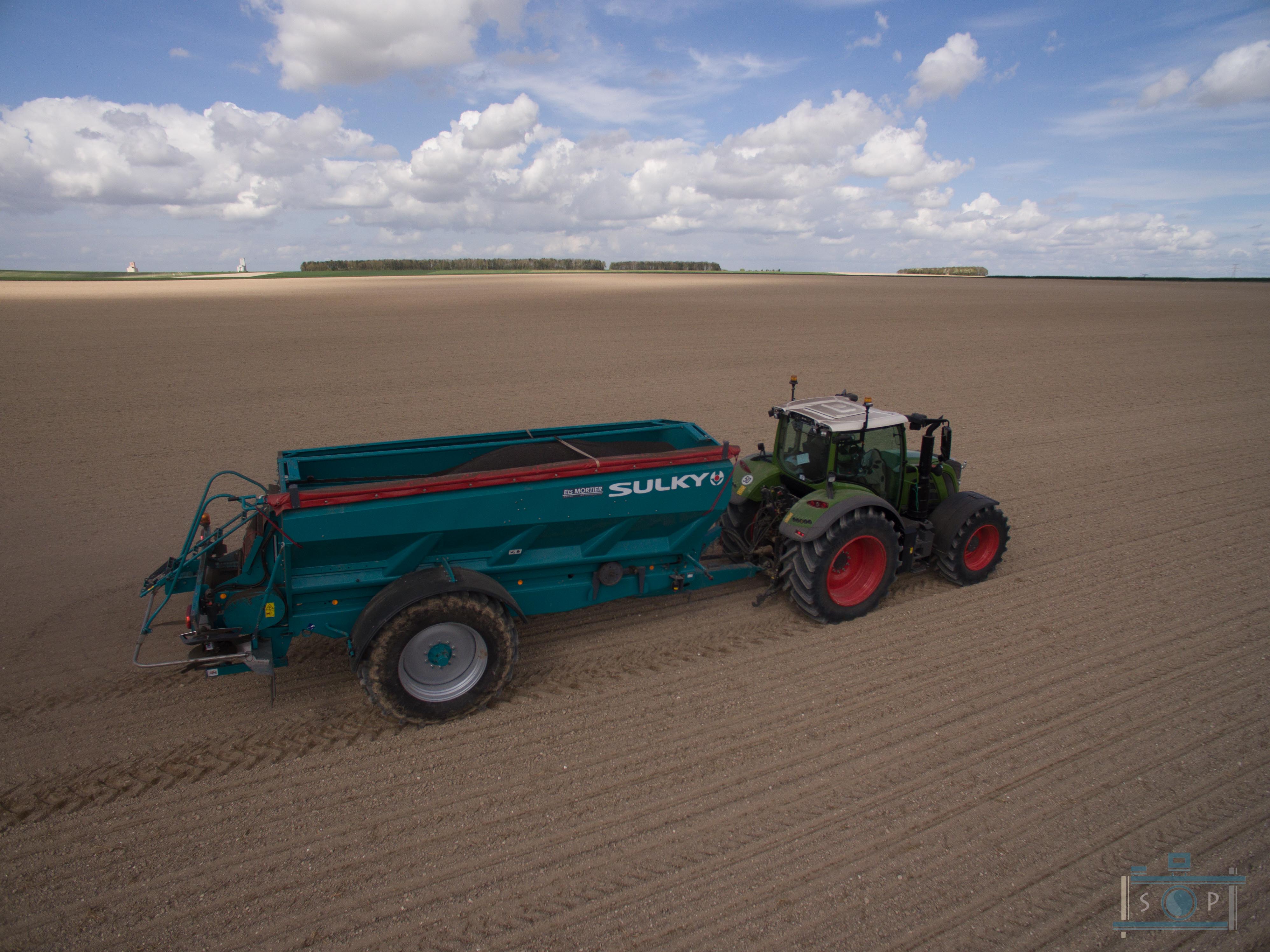 Chantier d’épandage de pellets organiques – Sulky XT160 – Fendt 720