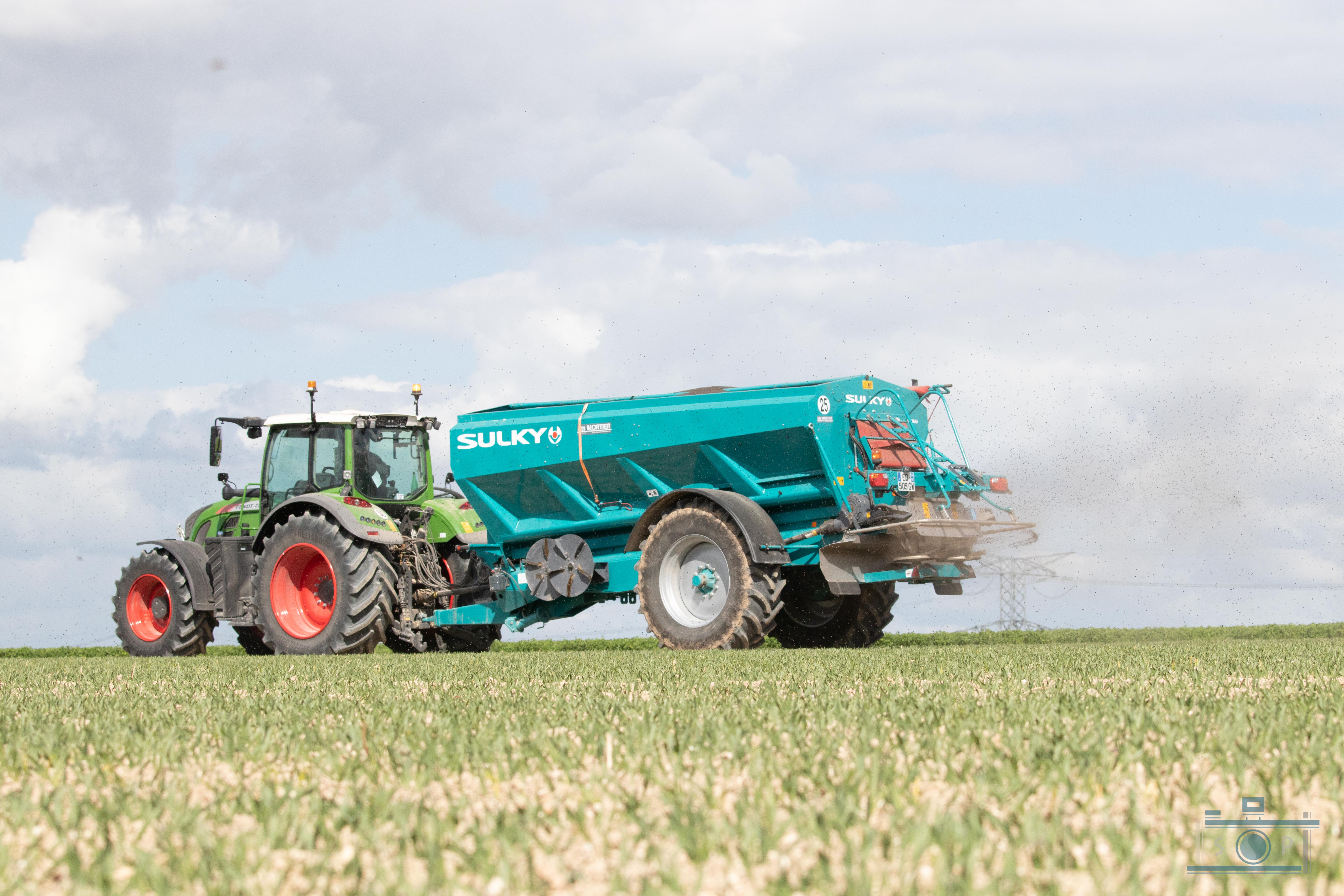 Chantier d’épandage de pellets organiques – Sulky XT160 – Fendt 720