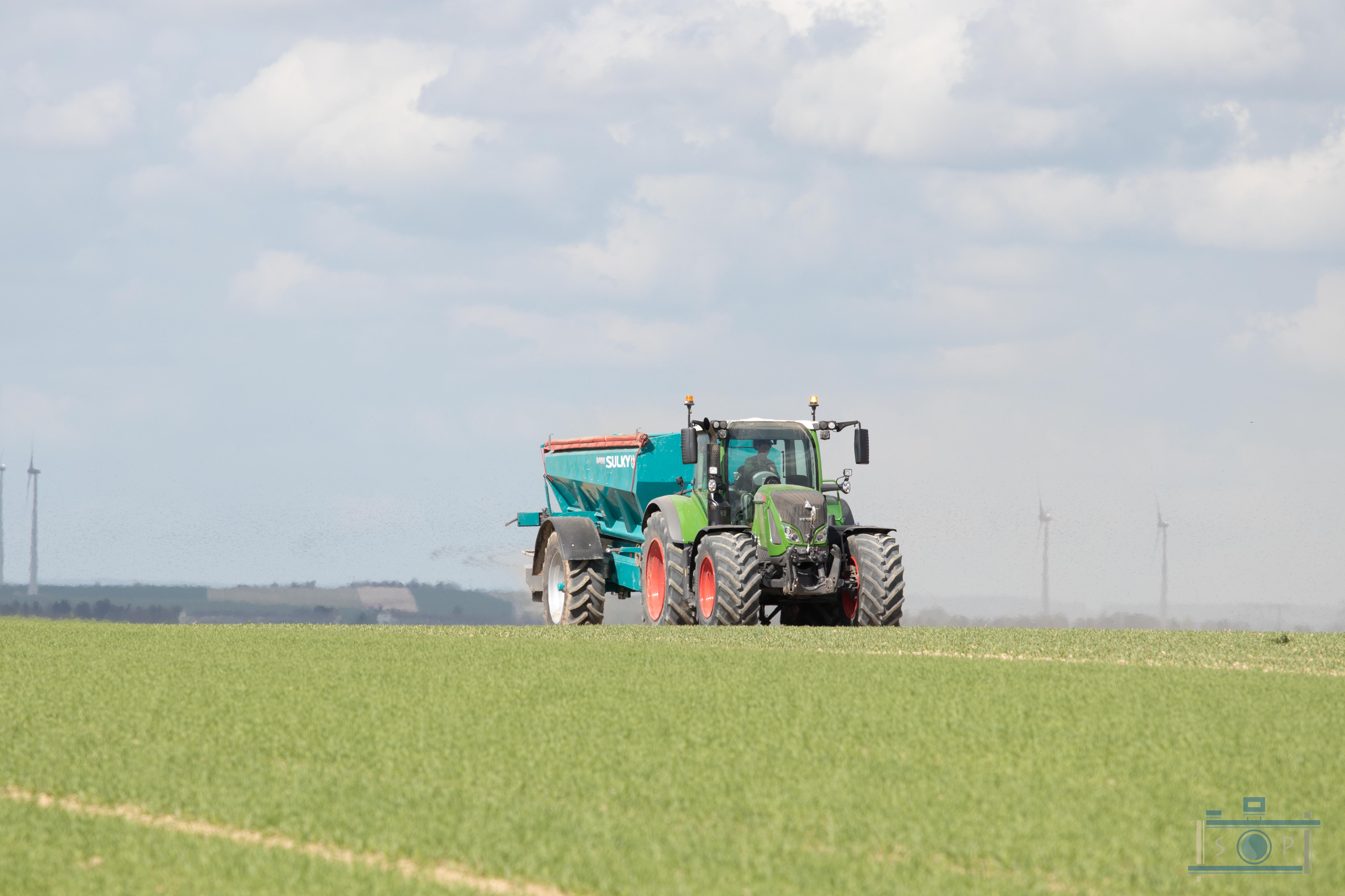 Chantier d’épandage de pellets organiques – Sulky XT160 – Fendt 720