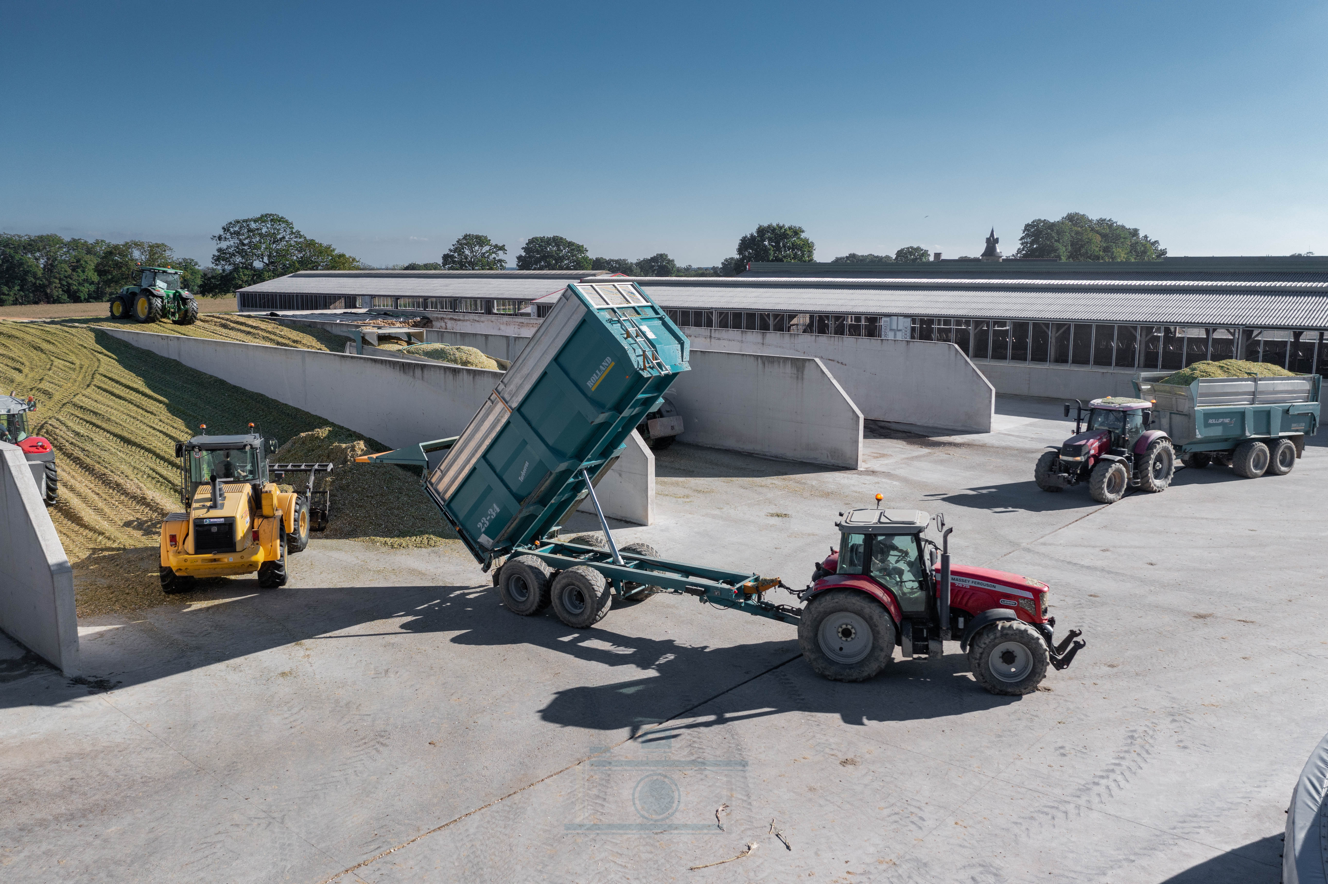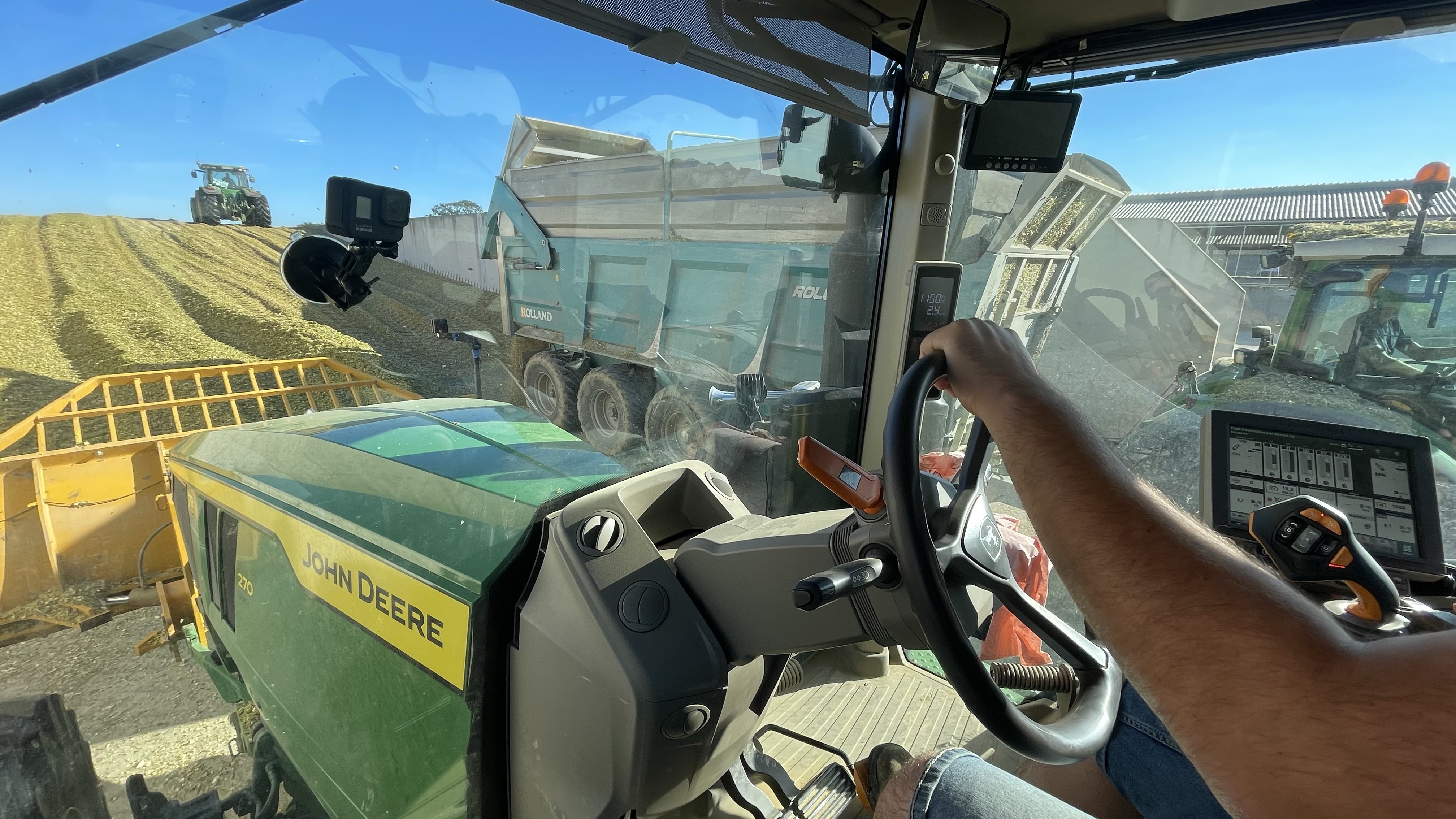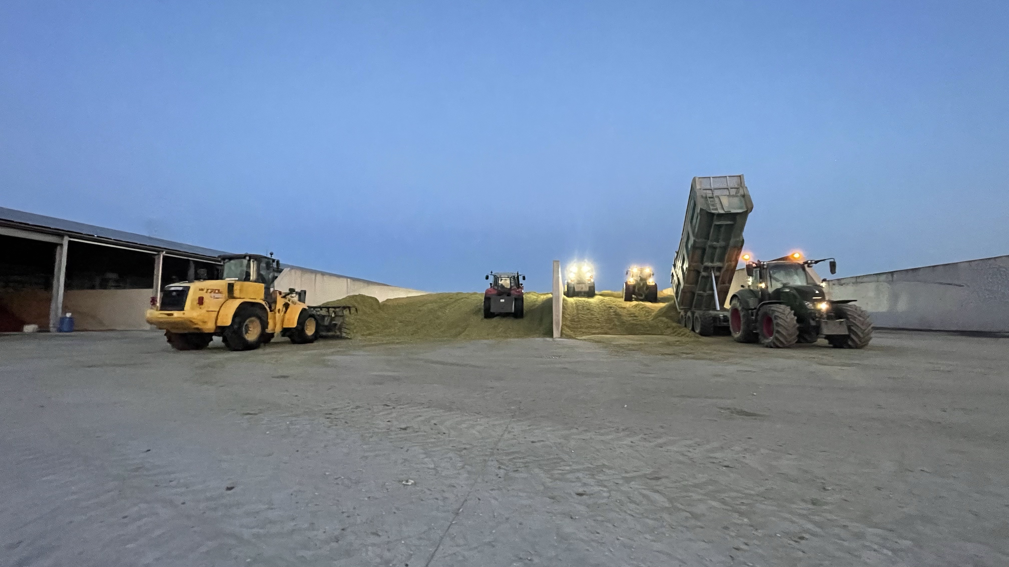 Revenons Ă notre chantier d’ensilage, Quentin et jean-François, deux chauffeurs de l’ETA m’ont invitĂ© Ă venir filmer ce chantier. Non pas uniquement parce que le lieu de l’exploitation s’y prĂȘtait, mais parce que 3 ensileuses de l’entreprise Ă©taient prĂ©sentes ce jour lĂ . L’objectif Ă©tait d’ensiler les 80ha de l’exploitation dans la journĂ©e. Autrement dit, il ne fallait pas chaumer. 2 jaguar en 8 et 10 rangs ainsi qu’une New Holland FR en 8 rangs Ă©tait lĂ . Au silo on retrouvait 4 tasseurs, 2 ensembles de l’ETA SAFFRAY, avec la chargeuse et un Massey Ferguson ainsi que 2 John Deere, 7R et 8R de Fabien Desserve, entrepreneur du secteur.